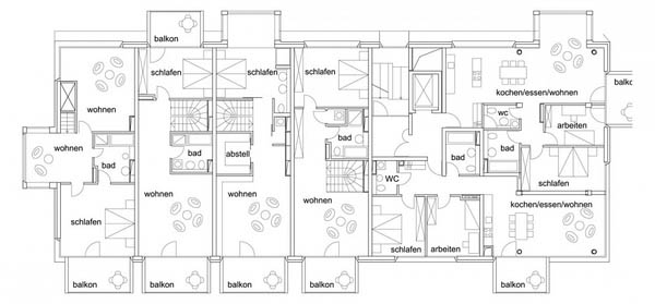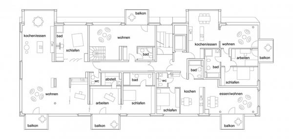 LOVE事务所面临一个特殊的挑战:Baufeld 10公寓楼是一个合资建筑项目。这意味着将来会由众多不同的住户为新建筑创造一个真正的社区。因此,大家共同合作,朝着建造他们的共同家园这一目标而努力。建筑类型必须满足这种期望。因此建筑内容纳了多种不同的类型,包括所有的配套标准——从超大的公寓(最大达225平方米)到小公寓(50平方米),而且有着完全不同的设计——从单层公寓到四层的复式公寓。