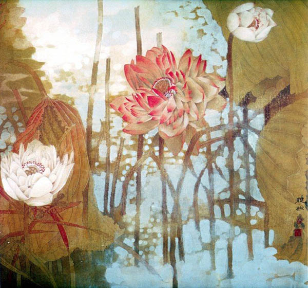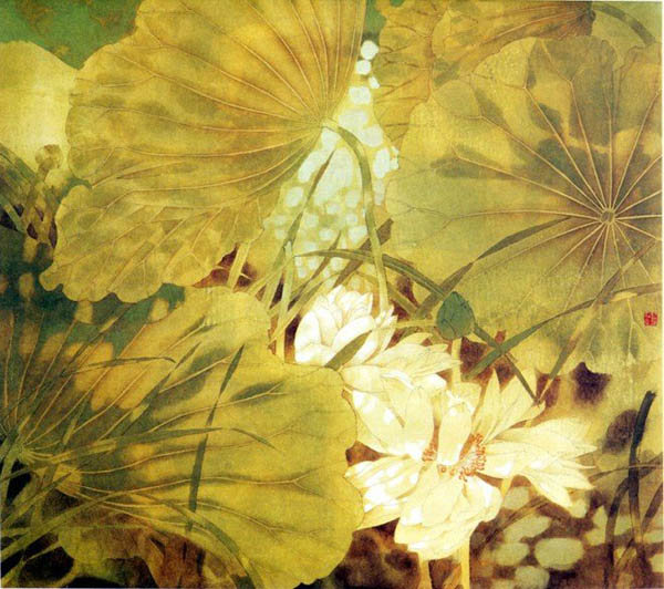 作品名称:荷塘初雨 创作年代:2002年 作品尺寸:30*52cm 作品描述:纸本重彩