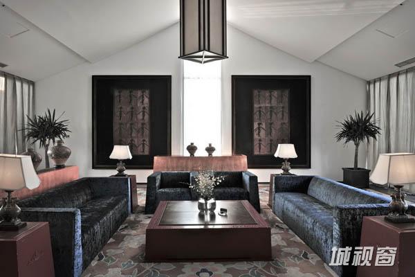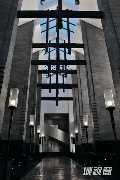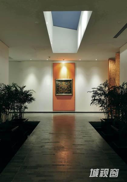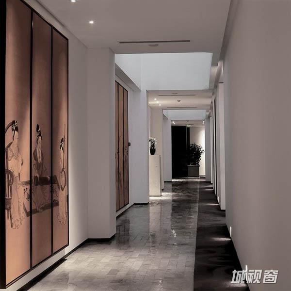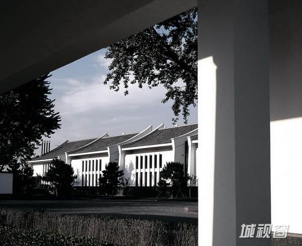 立会馆前广场中心东望,湖光如镜,湖边粉墙灰瓦别墅几幢,房前屋后绿树掩映,并果岭青茵映入湖中,看朝阳初起,入步仙境蓬莱.会馆广场西看,一碑亭居中,亭东亭西便是洗体池各一,净水映亭,亭中碑铭天仙圣母庙庙起因源,道教道理便是自湖东果岭西望,会馆如卧龙临波,虚实相间,层层叠叠,看湖中水佩风来,仙气弥漫,此景只应天上有.是夜,华灯初上,穹光膳堂的烛光,带着几许迷幻,散落湖面,若卧龙初醒,活灵活现.会馆尚水,得源东湖,以动奔穹光膳堂而去,落入洗尘阁前水禁.湖水之静,直取听雨廊西行,在馆前场留静水一池,鉴天洞地正当其中,又西去与会馆大门楼内庭汇出镜池四面,端端正正,中规中矩,是道中四理,再西去车辇场,碑亭东西洗体池,出车辇场西门进入政务院[无影方](玻璃会议室),周围环顾,轻举无影方于其中,每至冬令, 雪后夕阳, 水气引地温泉而满溢, 自亦仙亦道, 凭空蒸发, 个中皆是理、是意、是情、是趣, 风来无语, 动容生气, 仙自若定, 神自若行,皆非凡力。会馆, 形取帝王宫阙之宏制, 意得江南民居庭院之趣.隽永文质,大气而更得精致,青砖灰瓦、粉墙白壁, 缘起视界黑白与空色的修炼,碧水蓝天、青禾绿植,消息一派生机,秋风瑟瑟,大地萧萧,唯白墙高屋、灰瓦平楼,暮天中是形,也是灰为黑白,似无色,却意在万千,冬去春行,午后斜阳,花影、树印、云影、山形尽写于粉墙,斜阳西移,篁影东行,只是神仙识此图。