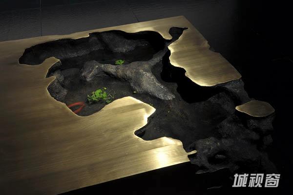 在历代文人雅士赏石、藏石的过程中,太湖石文化逐渐发展成为中国石文化的重要组成部分。作为中国陈设艺术委员会的主要发起人之一,梁建国认为经过自然雕饰的太湖石宛转险怪,形状各异,姿态万千,通灵剔透的太湖石,其色泽最能体现“皱、漏、瘦、透”之美,充分契合了个人秉承的设计理念:高雅的艺术设计也要体现趣味性,接近生活,形成人和空间的互动关系才能营造出充满愉悦感,舒适性的家居环境,为此,他亲自到山中挑选太湖石,运到工地加工,历时三天切割成基本的模型,根据每块太湖石的形状,浇铸铜水定型,做成形状各异的小块铸铜产品,再进行细致的打磨,用砂纸进行抛光处理,最后经过焊接做成设计的产品。将自然界赋予的形式美提炼保存下来,可谓别出心裁。