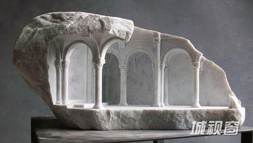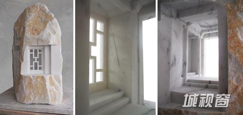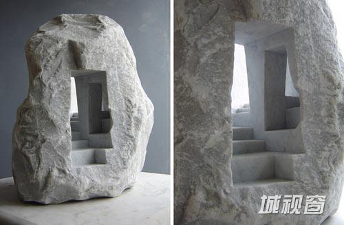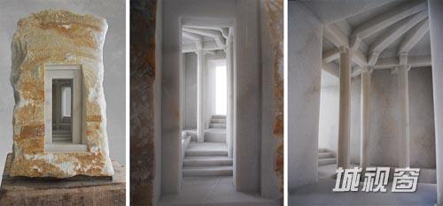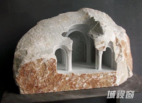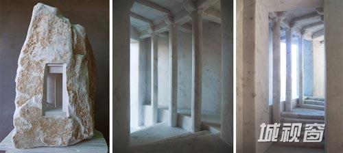 坚固的石头内雕刻出的建筑空间展现了一幅幅复杂的内部世界图景,变幻的视角和光线让雕塑呈现出不同的面貌。Simmond对石头建筑有着执着的追求,作为石雕师学习的绘画技巧为其作品大添异彩。石雕建筑尤其是宗教建筑是Simmond作品的主题。这些雕塑作品借助形式语言和建筑哲学,探索正反两种不同的形式,明亮与晦暗的意义及自然和人类的关系。