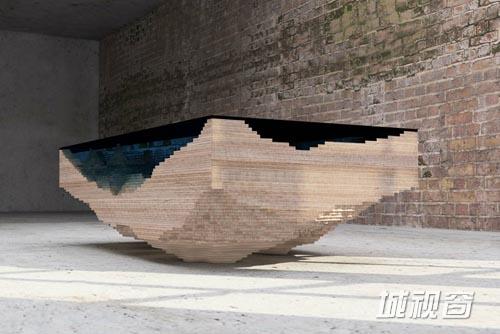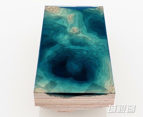 通过用玻璃和木板的层层堆叠,再现出一片湛蓝色海域的曲折形状,duffy london 工作室创作了一件名为“海蓝桌(the abyss table)”的作品。他们通过表现海底的剖面,把桌子变成了一张立体的“海底地形图”。“当我在玻璃工厂里,看到那些堆放在一起的厚玻璃时,我注意到了这样一种现象:随着玻璃层数的增加,它们的颜色也会越来越深——这跟海洋颜色的变化原理一模一样。”