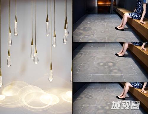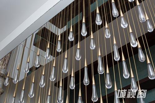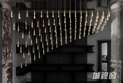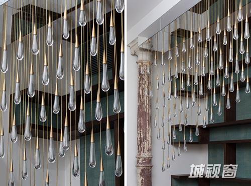 “倾泻”是DH Liberty在纽约特里贝克地区设计的一款悬挂在建筑横梁上的雨滴般的枝形吊灯。