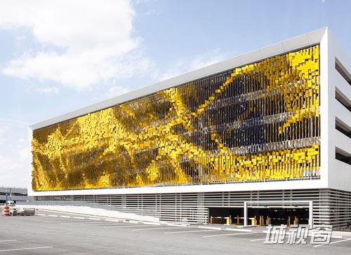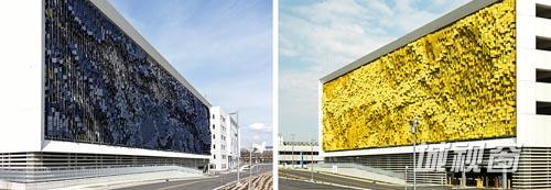 Urban的主持设计师Rob Ley提到他们用了长达6个月的时间进行设计和建造模型,这个设计基于数字化,并通过建筑师自己编写的软件程序实现最终效果。为了实现效果,整个大表皮上共采用了18种尺寸不一的面板。尺寸范围在300mm*600mm---300mm*1000mm之间。颜色的选择在西向采用了深蓝色,在东向采用了金黄色。两者在不同角度的呈现下产生不同的色彩外貌。整个18.5m H x 75m W x 1.5m D的项目无疑就是一件大型的公共艺术品。同时,因为其构造的设置,在遮蔽停车场内部结构柱梁护栏等因素的同时满足大量的通风需求,实现自然能源的最佳利用。