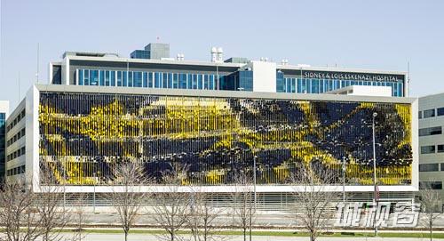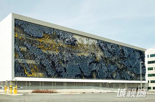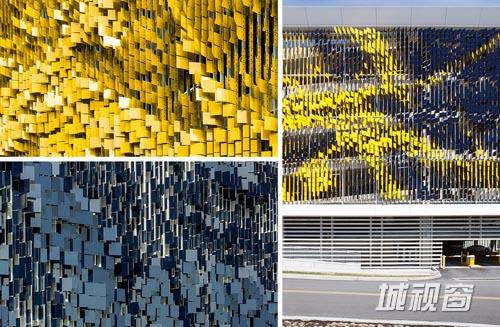 该项目通过将Eskenazi医院停车场外立面变成斑斓的二元混合区域,颠覆了传统停车场极其普通、毫无吸引力的基础设施形象。7000片弯角金属片与分别位于不同方向的深蓝、黄两种颜色一起创造了动态的立面系统。每一次在不同的角度观看和以不同的速度经过时都能欣赏到不一样的视觉盛宴。这样,医院旁边经过的行人和缓缓前行的汽车将会体验到颜色和透明度显著的斑点式变化;而在W. Michigan街道上飞驰而过的汽车驾驶员们会看到随着观看角度不同立面颜色所呈现的快速阶梯式变化。