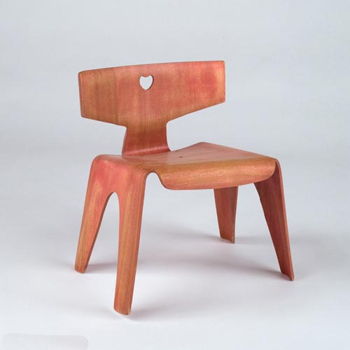 MOMA 珍藏椅中最受青睐的记录保持者── Eames 夫妇,在 1945 年儿童椅设计上,除了发表可爱的《Eames Elephant》,《Child's Chair》椅身与椅背的弯曲塑型,也是 Eames 将模压胶合板(Molded Plywood)技术发挥到更臻精细的代表之一,亦象征着有效量产的成熟。可彩绘的外型及椅背上的镂空心形标记,更赋予这张椅子散发出纯真而有趣的况味。
