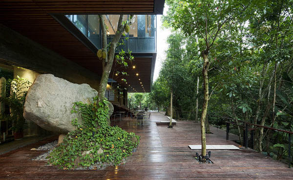项目位于海南七仙岭山区。基地在热带雨林一道峡谷底部,是一块不大的狭长空地,茂盛的树木和大块的岩石界定出它的范围。项目为一个1000平方米西餐厅。人们对于自然的认知是在人与自然的接触中形成的——或是亲历,或是想象。因此,本项目必须引导人与自然亲密交流,这样才能实现其设计意图。