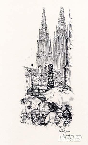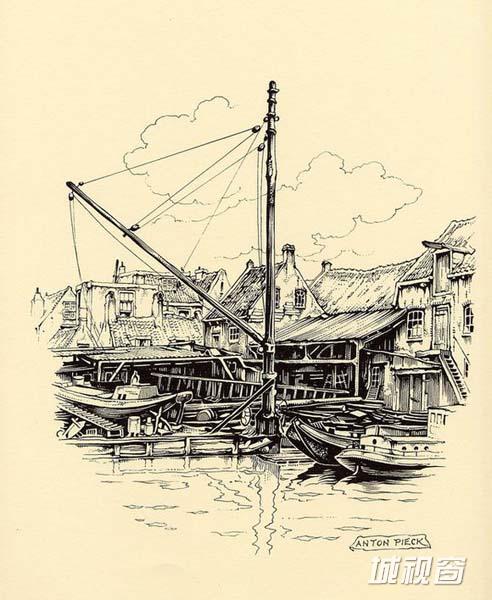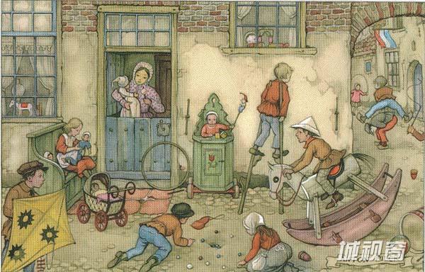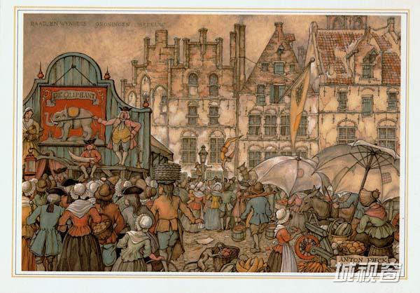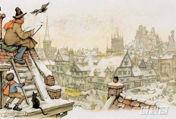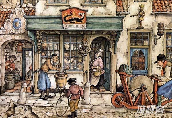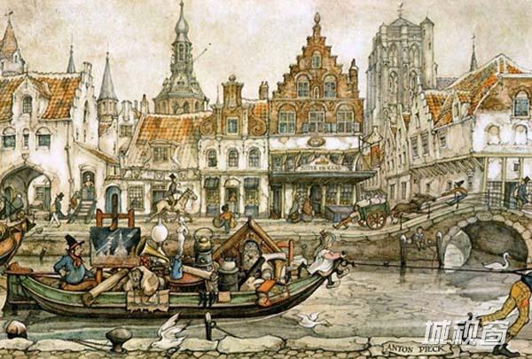 荷兰著名画家Anton Pieck (Anton Franciscus Pieck)1895年4月19日出生于Den Helder,1987年11月24日在Overveen逝世。11岁时,他就以一幅静物油画获奖,17岁时他在中学里获得了绘画证书。他的一生以教育为业,他曾在海牙的美术学院教授绘画。1902年,他接受了南非首府布隆方丹的Kennemer lyceum学院的邀请教授绘画,此后他一直在Kennemer lyceum教学,直至1960年正式退休为止。其作品自成一派,伴随着乡愁和童话般的人物,细节的把握尤其出色,笔法老练而坚定,同时却也有着发自内心的柔和,即使是描绘最坚硬最冷漠的事物,也能窥到一丝丝细腻的情怀,说明了他具有丰富的想像力以及对细节的惊人观察力。他的作品有油画、水粉、蚀刻、版画、石印、旅行写生和插图,他还为当时的剧院,书籍和广告创作插画。