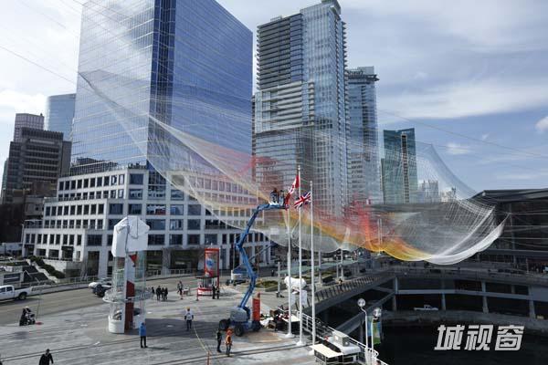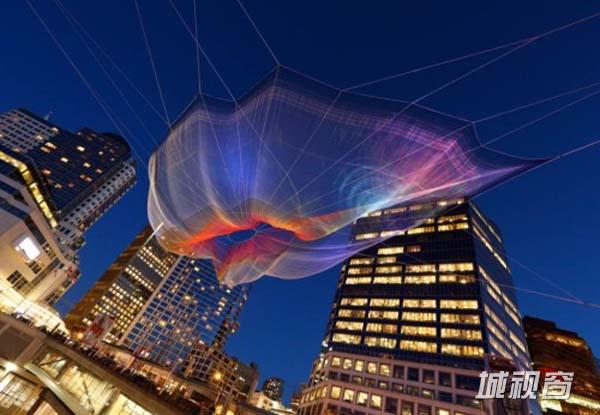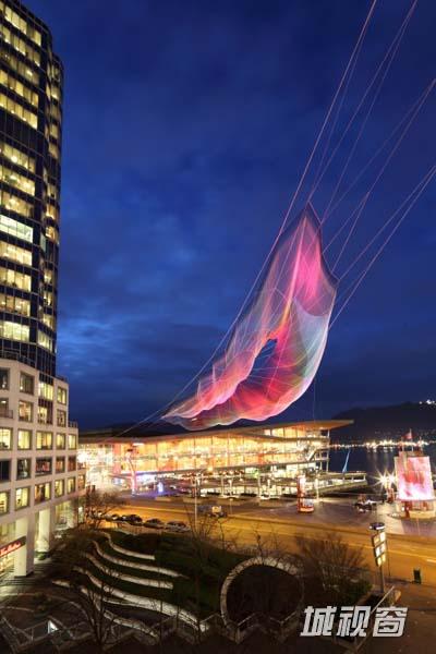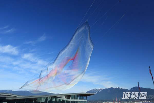 2014年3月在加拿大温哥华举行的TED大会30周年庆典上,美国艺术家Janet Echelman奉献出了她的全新之作:“星火绘画的天空”。这句话出自莎士比亚的《尤利乌斯·凯撒》。该雕塑创作以其大胆的创新而令人震撼,是Janet Echelman迄今最大的雕塑创作。该空中雕塑跨度达745英尺,重约3500磅,其中包含86万个由手工和机械打成的结,以及145英里长的纤维,其规模是这位艺术家先前所创作的最大雕塑的两倍多。与普通雕塑不同的是,这件纤维雕塑装置极具互动性,通过互动的照明装置,观众可以用智能手机来操控雕塑上灯光的变化,改变其表面的颜色和波纹,就像Echelman所说,每个人都如同那一抹星火,点缀着天空。而白天的时候,这件雕塑又巧妙地与天空和云朵融为一体。
