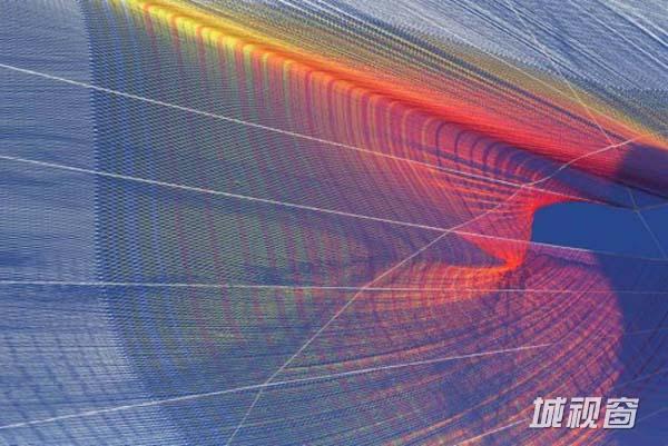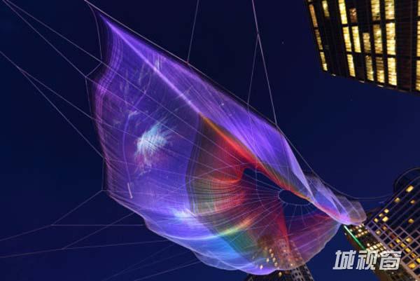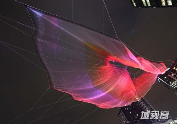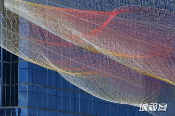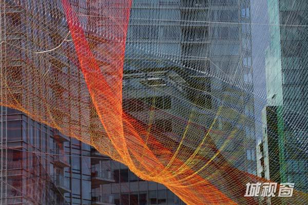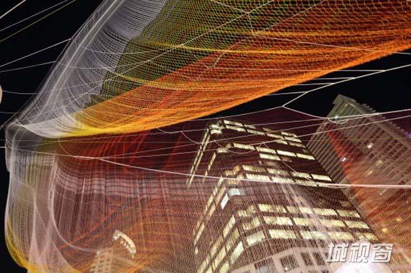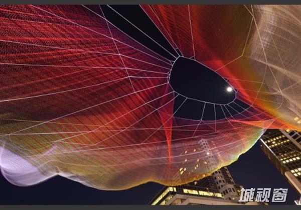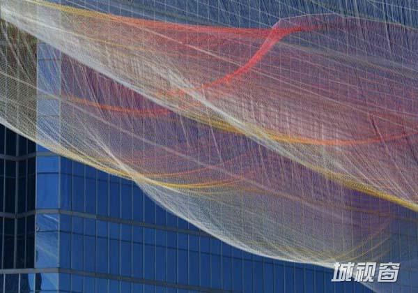 Echelman有着广为人知的重塑城市空间的艺术能力,将古代工艺和现代科技融合在作品中,并调动航空工程师、机械工程师、建筑师、照明设计师、景观设计师同自己一起合作,用她的网状雕塑改变城市环境。此次雕塑作品更是艺术与科技融合的体现,比如Echelman在作品中应用到的纤维材料——光谱纤维,这是一种超高分子聚合成量聚乙烯,专用于凝胶纺丝工艺,对化学品、水以及紫外线具高耐性。这种材料“同样的体积比钢强15倍,但足够轻”,提高了呼吸的形式,却比钢材还要结实,能够抵抗高达每小时96英里的风速。她表示,希望人们能从中获得安全感,却仍能与开阔的天空相连。“纤维给我工作所需要的力量,但允许我创建一个轻且精致的结构,随风移动。”Echelman如是说,她使用彩色网状结构在空中搭建出巨大的漂浮作品,材料柔软通透,作品本身可随风的运动而自由改变形体,配合灯光效果,炫目犹如极光。