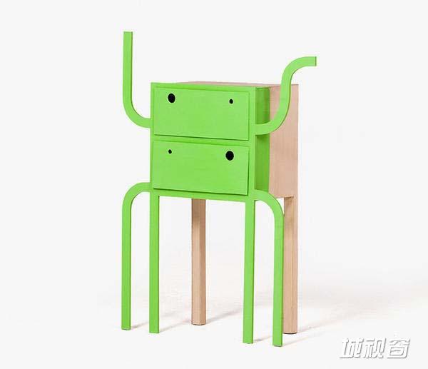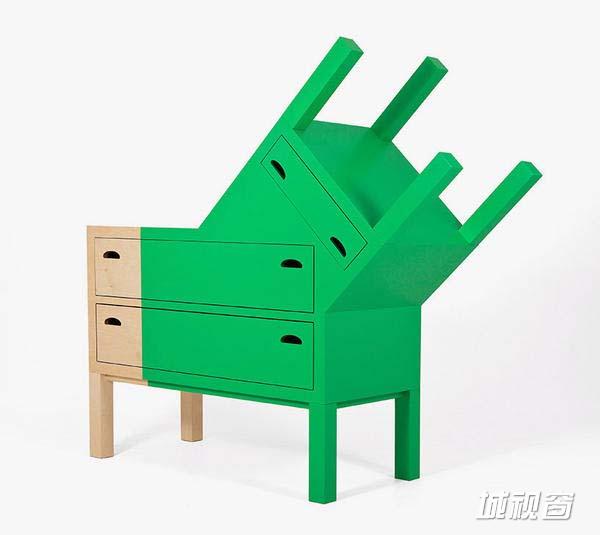 每件作品都是有生命的,例如下图绿色的家具就叫做:双面人。没有油漆的是正常善良的人,而涂了绿色的则代表着邪恶。这种融合又对立的人格塑造不正是微妙人与人之间,人性之间的争议与邪恶的对立存在吗?