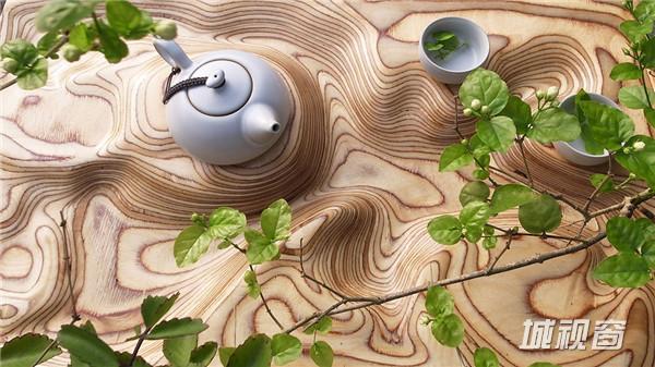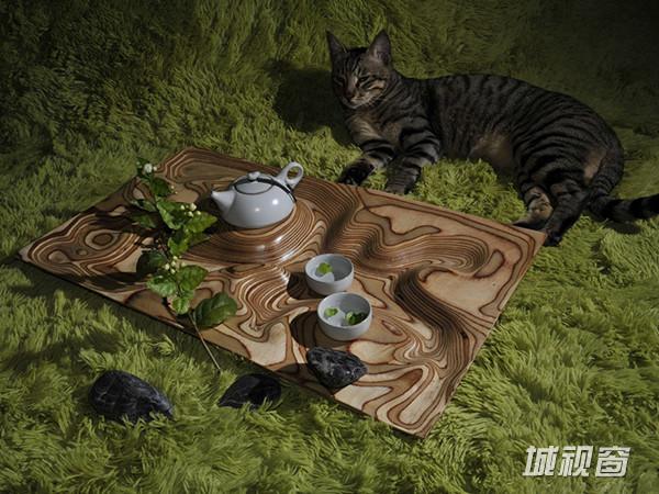 这个茶托的名字叫:“汇流”(Confluence),是一个可放置6个茶杯的小型木质茶托。由桦木胶合板双面雕刻而成的轻薄茶托带来了起伏山丘般的美丽景观。层叠胶合板在深深浅浅的接缝的衬托下让山丘地形更加突显。凸起的山峰下形成了凹陷的蓄水池。溢出的茶会自然流入池内,形成小湖泊。随着茶水的不断流入,水面不断抬升,像极了下雨时湖面上涨的情景。