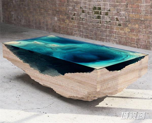 茶几:深海之蓝 灯光穿过桌子上的小孔,洒在地上。