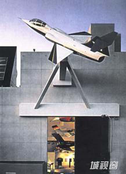 1982年设计的加州科学中心航空馆,一架洛克希德F-104战斗机安置在入口上方。