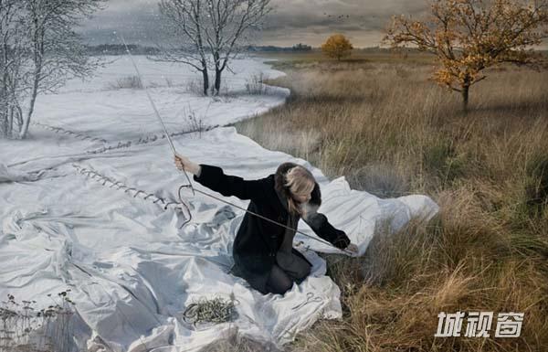 照片为Johansson先生的作品“期待中的冬天”,一名女子正在将雪白的毯子缝合在一起,以期在秋天的风景中创造出冬天的氛围。