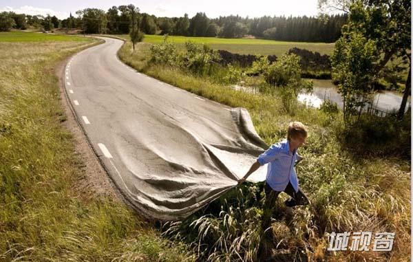 作品:走自己的路,其向人们展现了一名男子在草地上铺沥青马路的景象,其是将风景与男子拖拽毯子的动作相结合创作的。