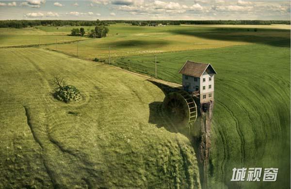 这张图片名为降落,其是将流淌着油漆的纸板模型与真正的房子和草地向结合创造的。
