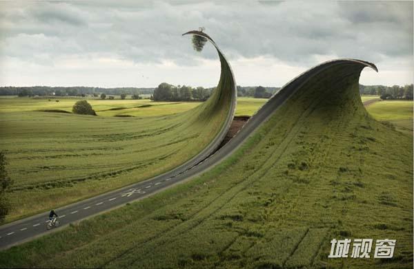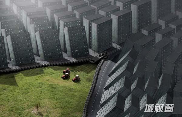 这幅奇异的画面名为“拉链城市”,绿色草地上的拖拉机正通过牵引拉头闭合拉链,藉此来将两侧的灰色建筑物相连接。