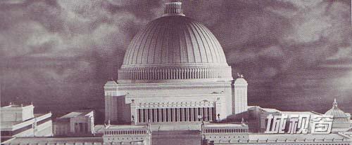 有趣的事实:其中插图设计里可见,有着纳粹鹰图的基座使人民大厅变的更加吸引人。沿着这个鹰造型的基座延伸至右边希特勒头像的阴影里,这个幻想式的设计被确信仅仅出现在那年的特殊时期。