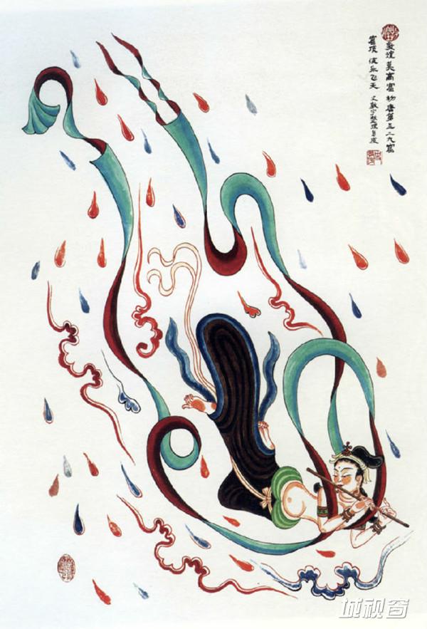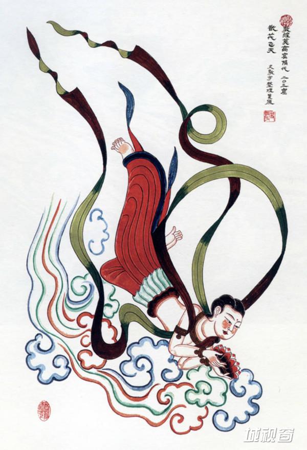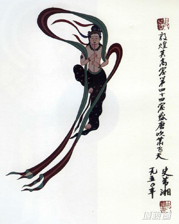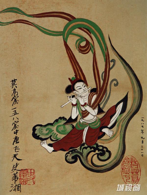 飞天吹奏横笛,曲身向下飞翔