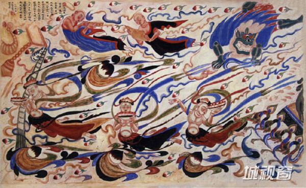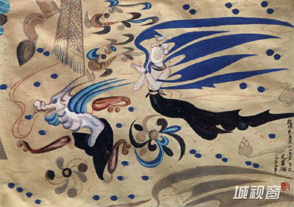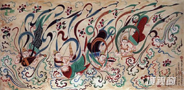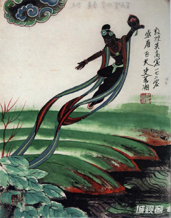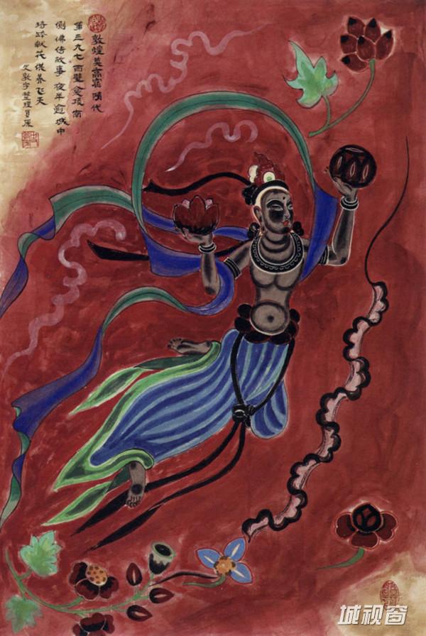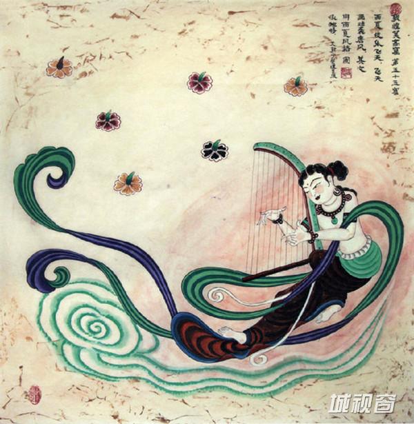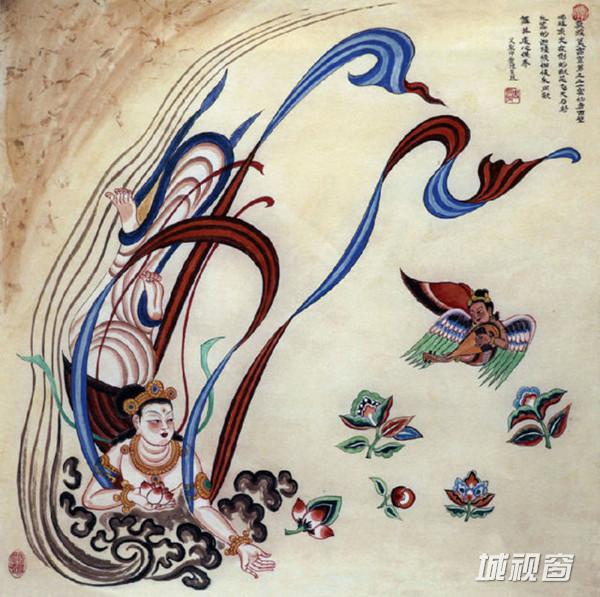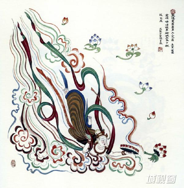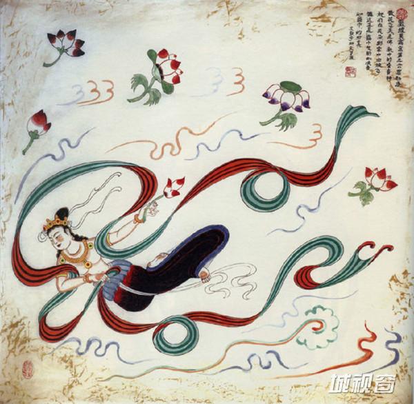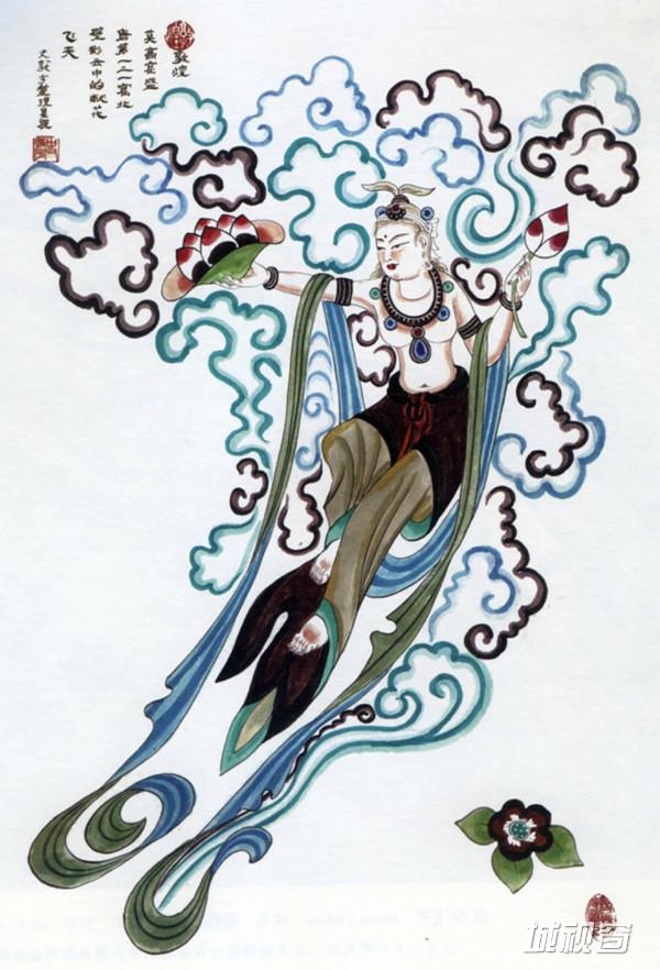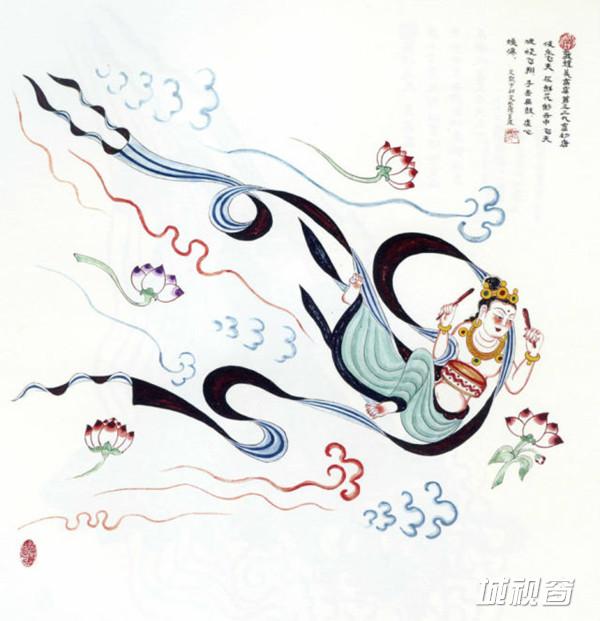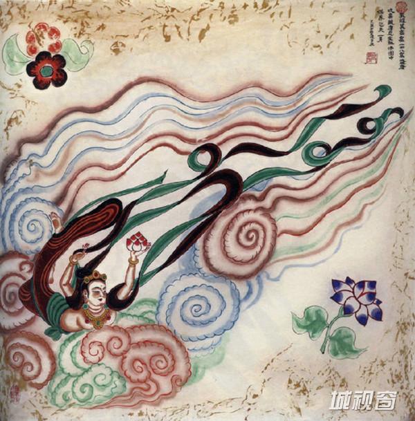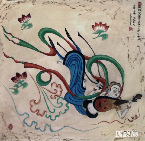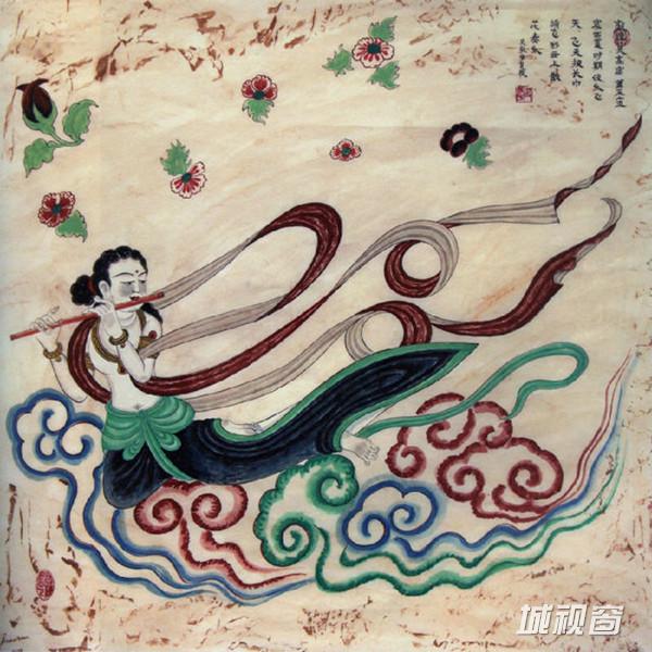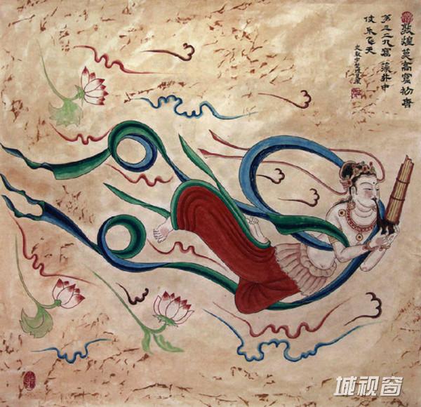 飞天吹奏芦笙,在莲花、彩云中遨游