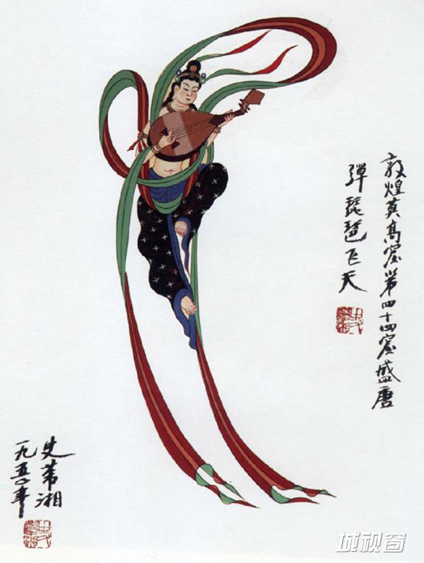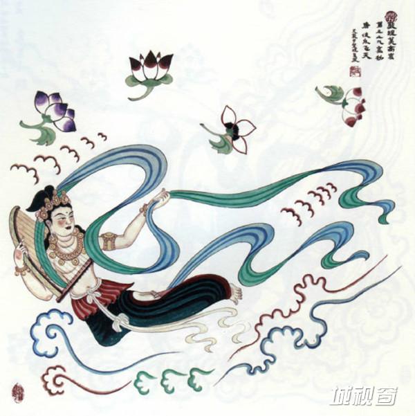 飞天怀抱琵琶,在莲花、彩云中娱佛