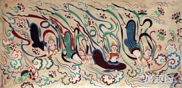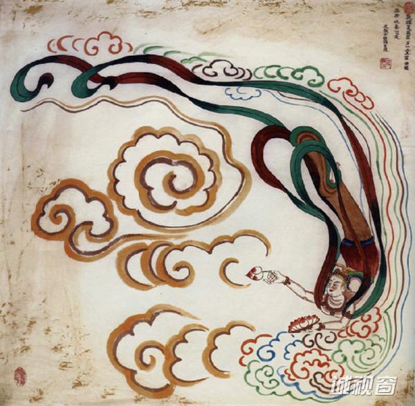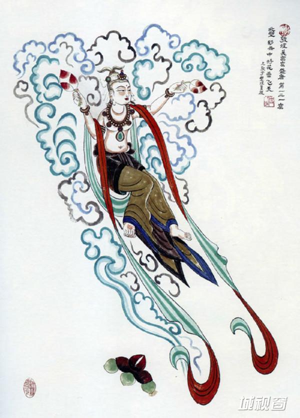 散花飞天是佛教中的香音神,她们在花朵彩云中回旋飞舞