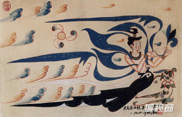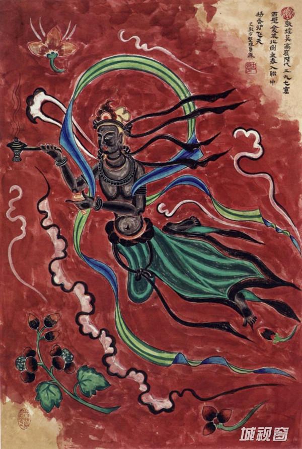 此飞天的画法沿袭唐代,同时又有明显的西夏风格,故很独特