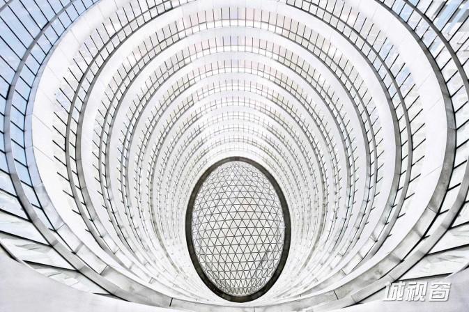 丰富的线条,创意的造型,银河SOHO作为一个新的地标性建筑,很适合用镜头语言去描述它,就像看一个精美的工艺品,从每个角度,每个线条去表现他的美丽。拍摄银河SOHO内部曲线时,通过使用广角镜头,来烘托建筑内部的空间。拍摄时选择视角非常关键,一个好的角度会让你惊讶的发现,构成的美妙。如图1,当时我在顶楼,习惯性的向下看一看景色,于是就发现了这个如同贝壳一样美好的线条,当时光线比较弱,并没有难看的阴影,所以画面中更能突出几何构成的感觉。
