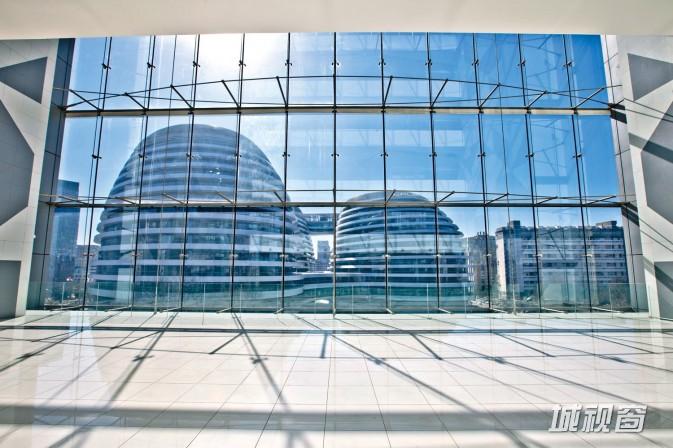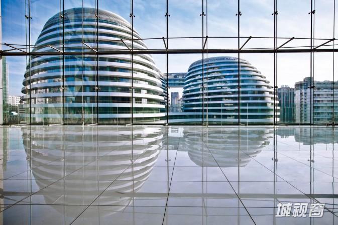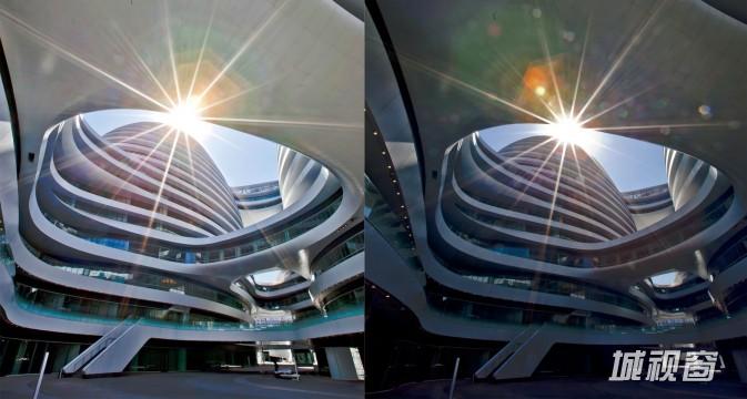建筑的不可移动性,或许会使得大家都觉得“拍和不拍,它就在那里”,什么时候去拍摄都是一样的,其实不然。可以运用“反射”和“倒影”来表现建筑的特点,这是很实用的,在很多拍摄题材中都可以运用。例如下图,我是在银河SOHO对面的玻璃大楼中拍摄的,当时是正中午,进入大楼的6层平台,阳光很刺眼,地面没有反光,但是我记住了框形构图的小技巧,于是运用相机HDR拍摄了一张“窗外景色”的画面。并找好角度,等着下午地面能够反射时再过来拍摄。下午回来后真的没有让我失望,漂亮的反射在地面形成倒影,画面开始变得有趣。所以拍摄时要掌握时间,学会在复杂中找到亮点。