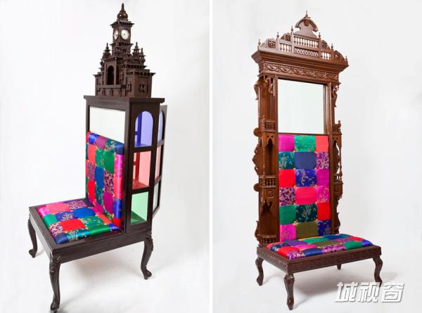 印度设计师阿帕娜基于古老的家具创造了一系列天马行空的椅子。椅子用A级柚木木材和回收古董物品制造,两者之间存在着错综复杂的渴望,就像是深陷一个幻想的世界,每件物品都讲述了一个不同的故事。细节如蝴蝶、花朵和相框集成到结构框架中,并将它们转化为独特的艺术作品。这些椅子不仅给人们提供一个坚固的坐处,精美的丝绸与仿皮、明亮的颜色和手绘斑马模式也唤起一种奢华和幽默。