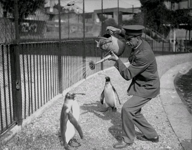 动物园管理员用喷水壶为企鹅淋浴,1930年