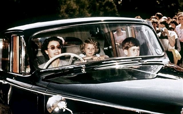 驾车载着查尔斯王子和安妮公主的英国女王伊莉莎白二世,1957年