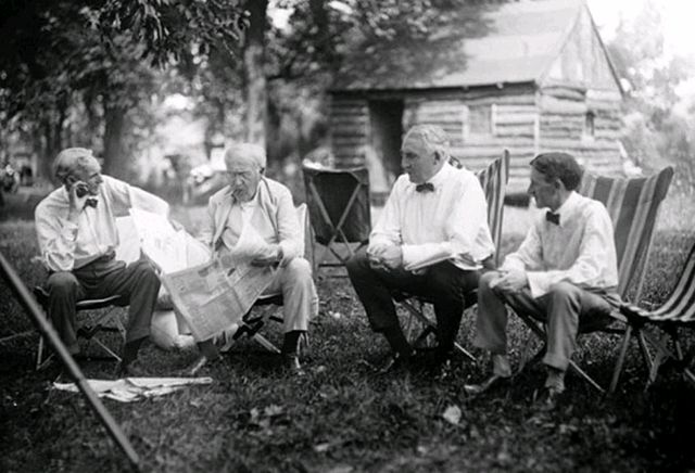 从左至右依次为:亨利·福特,托马斯·爱迪生,美国第29任总统哈丁以及商人哈维·费尔斯通,1921年