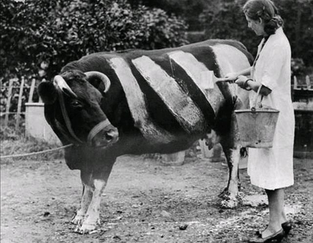 第二世界大战期间英国农夫为保护牛不被车辆撞死而在牛身上涂上颜色,1939年