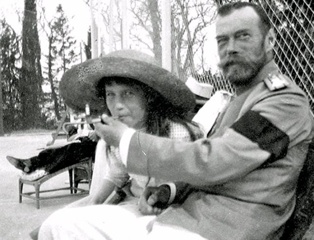 俄罗斯尼古拉二世皇帝正将烟嘴递给阿纳斯塔西亚公爵小姐,1916年