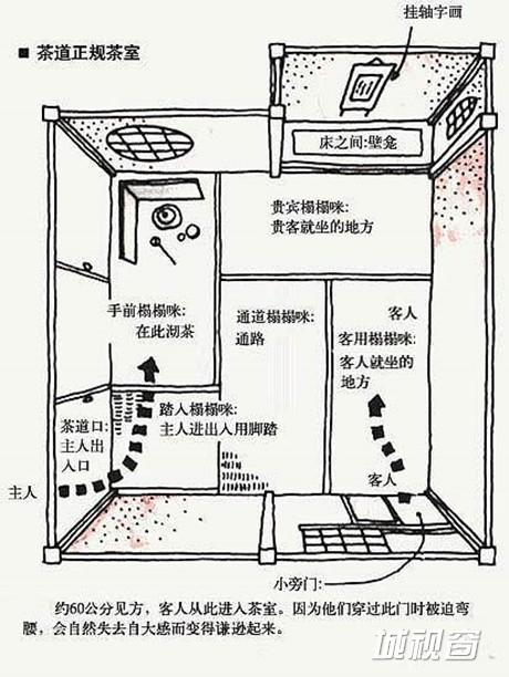 人们进入茶室后,首先要跪在壁龛前行最高的礼,拜读挂在壁龛里的禅宗墨迹,观赏茶花。茶室中非跪行不能进入的小入口,也许是世界上建筑史上最罕见的设计了。