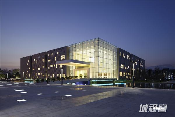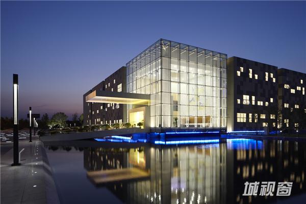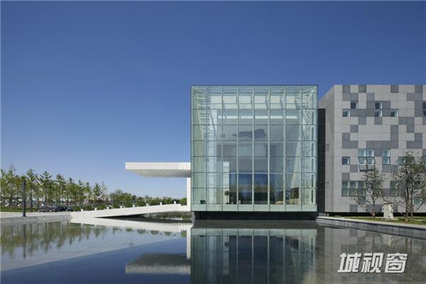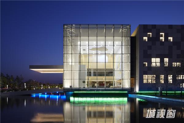 这座建筑地上三层,容积率0.3,总建筑面积约为10300m²,分成展厅和办公会议区两大部分。我们可以将其理解为类似九宫格的微缩传统里坊:由16个16米见方的盒子通过2m的深色玻璃体连接而成,每个盒子都有对应的空间功能,盒子与盒子之间是整个建筑的服务空间和交通空间。场地南侧为视觉开放区,由大面积的水域和广场组成。整个展馆就如同一个多宝盒,给人以悬浮在水面的感觉。入口与广场之间通过一座桥连接起来,夜间通过泛光处理,将建筑和环境融为一体,形成一种未来的梦幻气质。