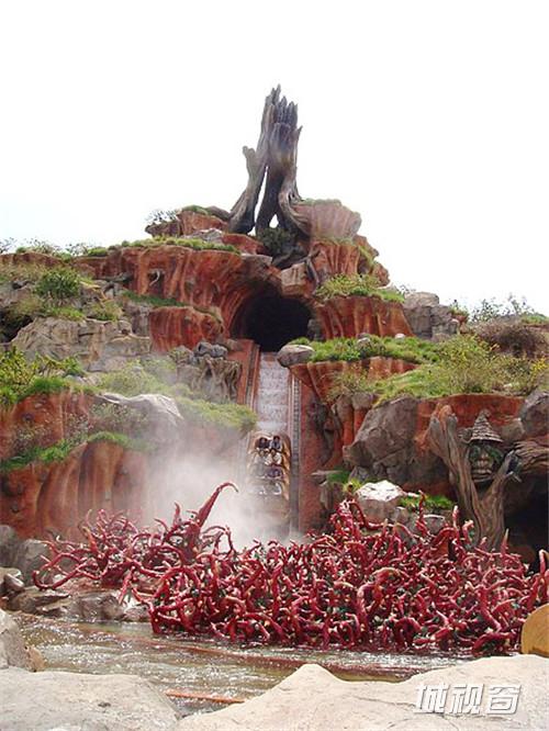 这段经历具有极大的视觉冲击力:通过设计,游客在这段几分钟的路途上可以看到五种场景。明亮色彩、音乐和神秘噪音的使用,让飞溅山得以激发集体记忆的图像和感觉部分。许多人等候长达一个小时,只为坐上飞溅山的过山车。