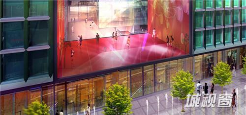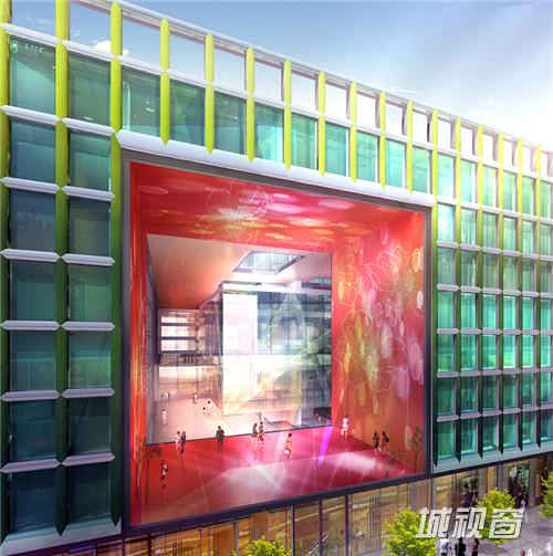 综合体正门面对着王府井大街,面向教堂和露天广场。设计意在将户外活动吸引到内部空间。对于综合体的外观,设计进最大限度保留其清晰的几何图案。建筑的“骨架”以半透明的方式呈现在外观上,若隐若现。综合体外立面的颜色即是玻璃的颜色,主要为红、蓝亮色。根据光照、视角、玻璃的厚度以及玻璃叠放方式的不同,外立面也将反射出不同的颜色。向西700米正是中国传统建筑群紫禁城,她恰好诠释了创造一个被围合的核心的可能性——创造自己的世界、自己的视角。