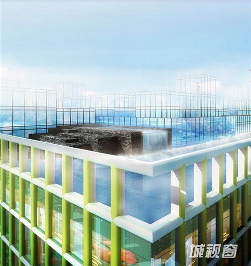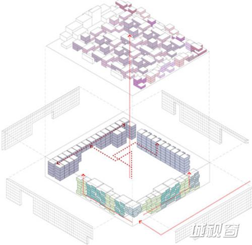 该综合体外表成立方状,内设十层,此外还设有顶层公寓。顶层公寓的设计借鉴了传统胡同结构。站在综合体顶部,这些公寓总会使人们联想到传统胡同的现代表现形式。这种策略有利于堆叠两个截然不同的类型的生活方式- 胡同和面对街道的公寓。外墙缝隙系统将自然光引入内部空间。