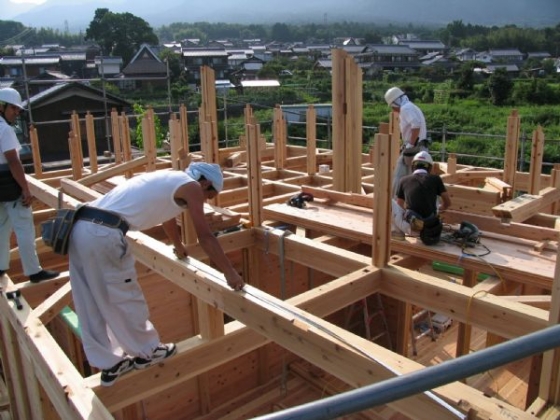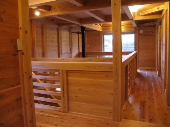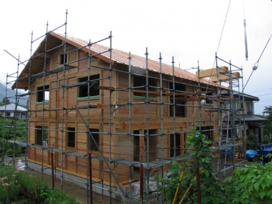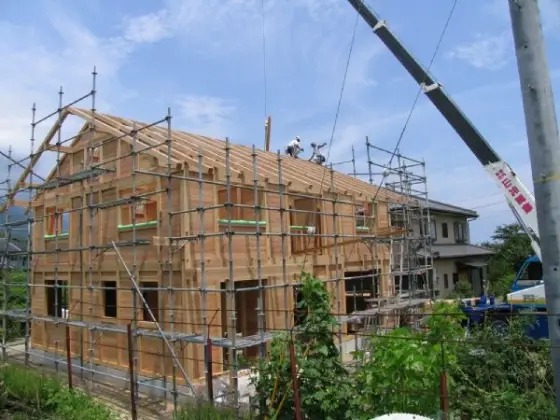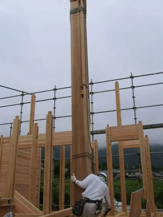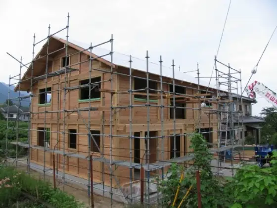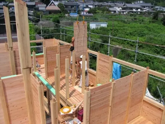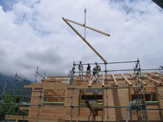 从图中可以看出,一楼位置的木结构承重骨架,已经搭建组立完成,并随时进行了部分壁板的安装,现正在进行二楼位置木结构立柱的吊装就位。