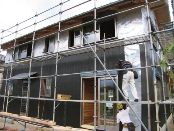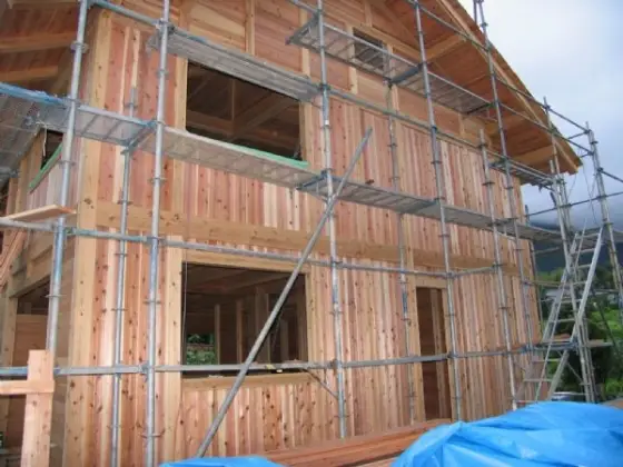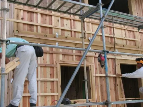 外墙壁板外侧,设置通风层木条构造,施工现场