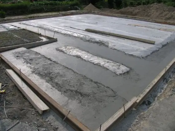 从图中可以看出,底板下部,事先已经铺设一层防水、隔潮塑料薄膜,局部区域,有条形混凝土垫层增强加固,底板基础,施工现场内部,开始布放钢筋,准备浇注底板基础部分的混凝土。