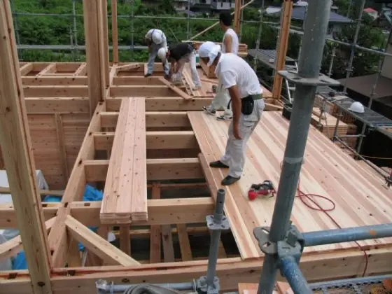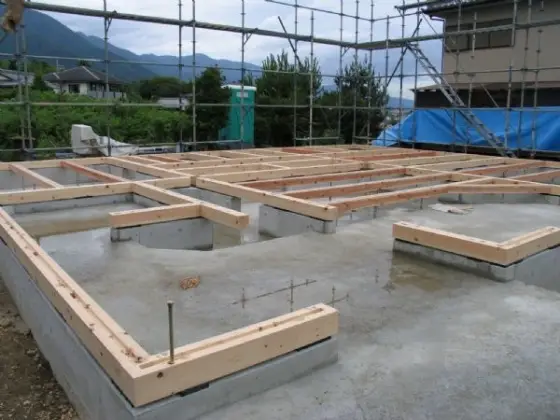 从图中可以看出,钢筋混凝土基础顶面,已经固定一道木结构框架,这部分位置的木结构框架,在日本叫“土台”;土台是上部承重木结构框架与下部钢筋混凝土基础进行连接固定的中间过渡部分;