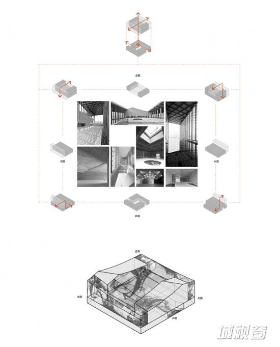 在此理念基础上,范曾艺术馆构架起以井院、水院、石院、合院为主体的叠加的立体院落。“叠合院落“的初衷是期望在受限的场地上化解建筑的尺度,将一个完整的大体量化解为三个更局部的小体量,这更便于设计师以身体尺度完成对院落的诠释。作品从类似于网格化的控制体系以及整合全局的大秩序中脱身出来,从局部的略带松散的关系开始。三种院子由于各自的生长理由被聚在一起,由于连接方式的不同而出乎意料的充满变数。整体建筑如同一个可以水墨浑融的空灵腔体,为浓进淡出的晕染留有发挥的余地。