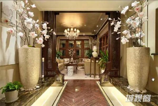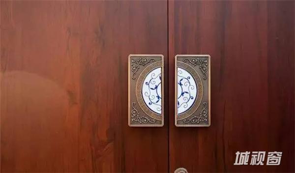 门庭所用将军门。据说是进口东南亚柚木外包铜边。把手很有特色,内嵌青花瓷板。看上去很精致。