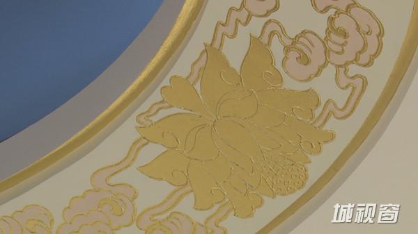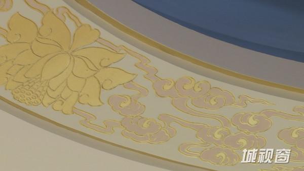 关于顶部的设计,也是我非常想介绍的一个部分。这是一个涅槃重生的图案,2月15日是释迦牟尼诞生的日子,之所以做这样的设计,是希望通过这种宗教感的东西,让离去的人进入到另外一个世界。上面的图案采用了包括宝相花和云纹的图案。宝相花在传统图案中非常多,它是牡丹和莲花合体的造型,实际上是把美好的东西集中在一起,在现实生活中并没有这种花。我们整体的设计思路上希望这个环境祥和安静,对离去的人是一种尊重,对活着的人是一种安慰。