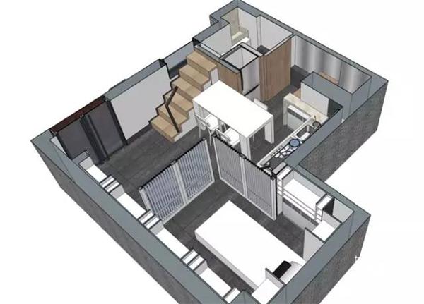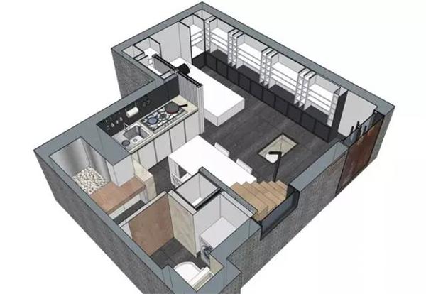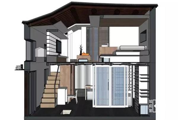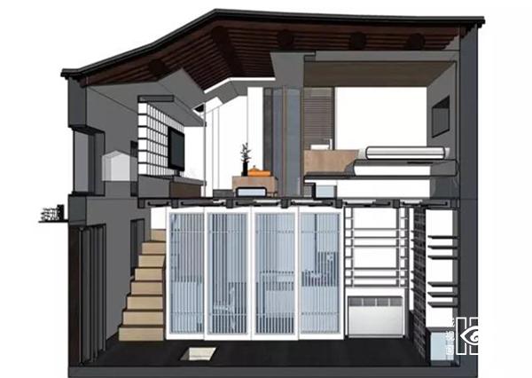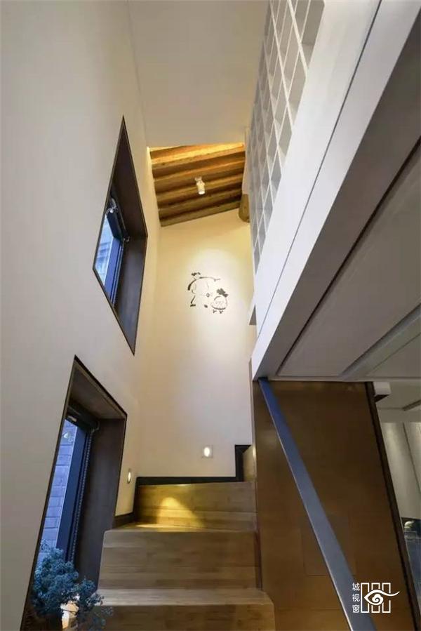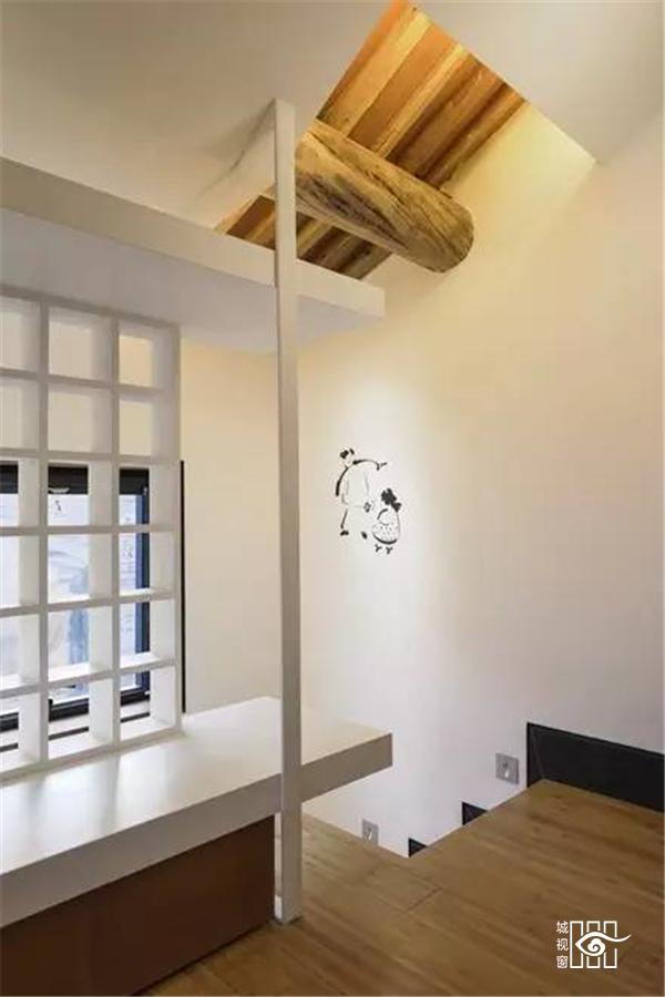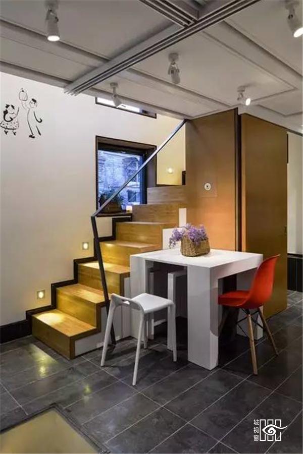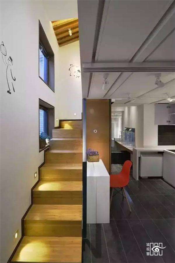 为了空间达到舒适和美观兼具的效果,设计师刘道华和他的团队,在前期平面和交通流线的规划方面,花费了大量的精力,方案在短短的十五天之内做了十几个版本,尤其是楼梯位置的安排,更是大费周折。在最早的方案中,设计师刘道华规划将整个屋顶揭开,往上加建,楼梯的位置进行变动,但是因为房子是属于政府,私人不能随意对外立面进行加建改造,因此又将楼梯位置设计到原来的位置,后来几经周折,把楼梯位置移动到大门入口处左侧,又因为这个位置一层高度是2米,二层只有1.5米,所以将空间做了挑空处理,靠近街道的两个窗户刚好解决了采光问题,同时,挑空处理也便于一层和二层的通风。当楼梯的位置确定好之后,其他的功能规划便顺利地依次展开了。