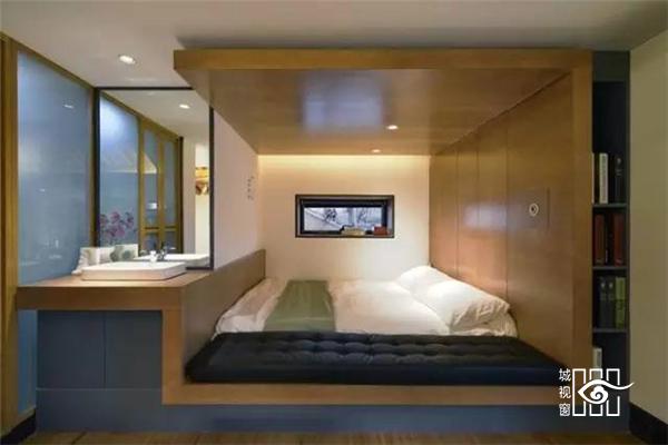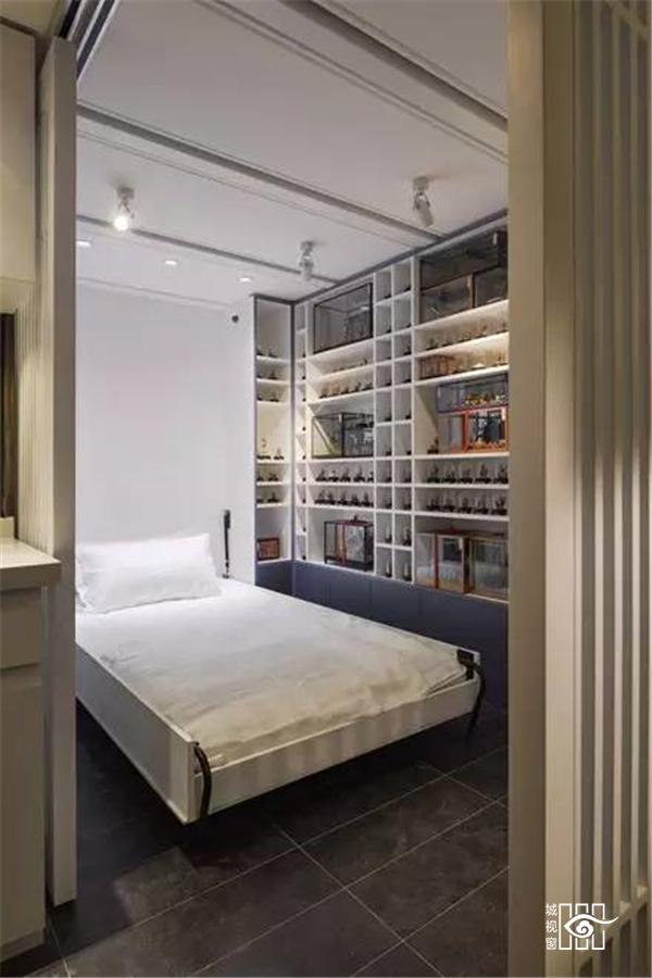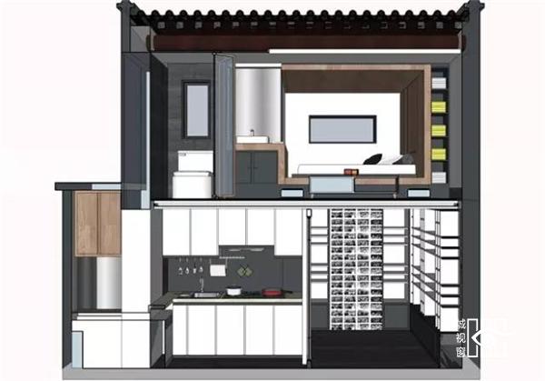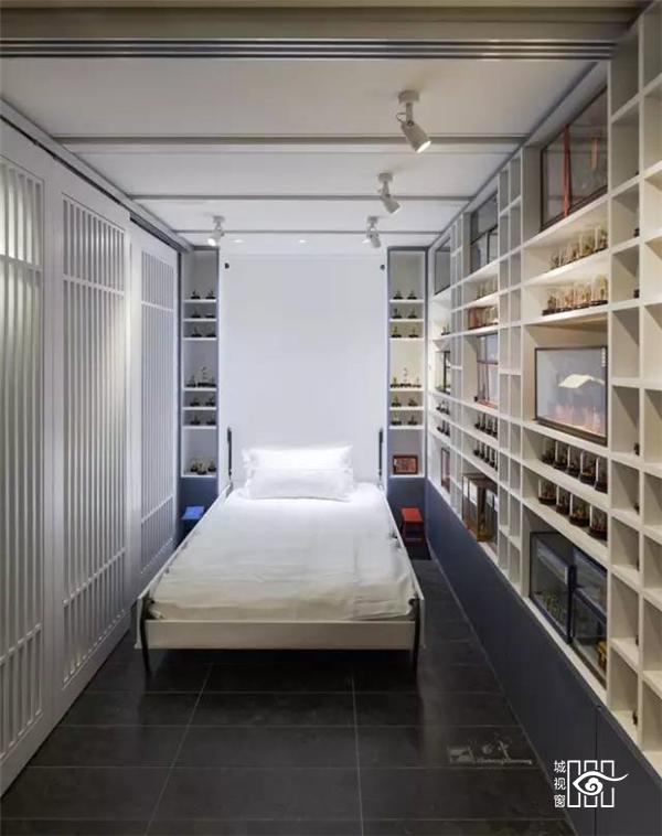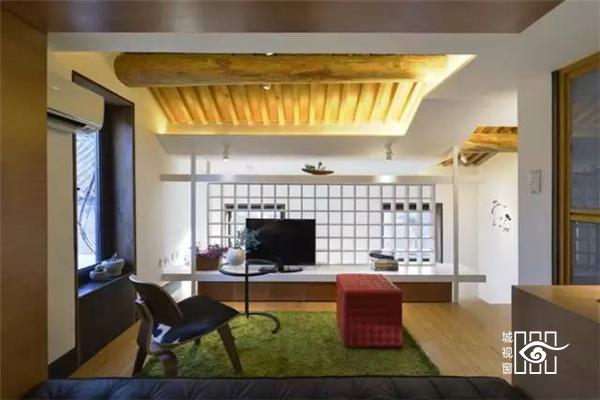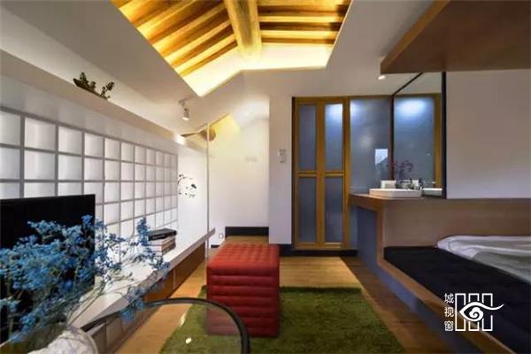 二层,作为郭氏夫妇的私密,设计师刘道华在墙面设计了一个床,床底下有储物功能,墙上同时也兼具储物功能,同时,设计师刘道华考虑到郭氏女主人患有糖尿病,每晚要去三四次卫生间,于是在二楼增添了卫生间功能区,另外,还放置了沙发、电视、小桌椅,成了简单的客厅。因为空间面积狭小,设计师并没有做太多的造型,只是将原来的梁木裸露出来,同时,在二层开了窗户,通过窗户可以看到什刹海风景,成了家中一副随着四季变化的风景画。
